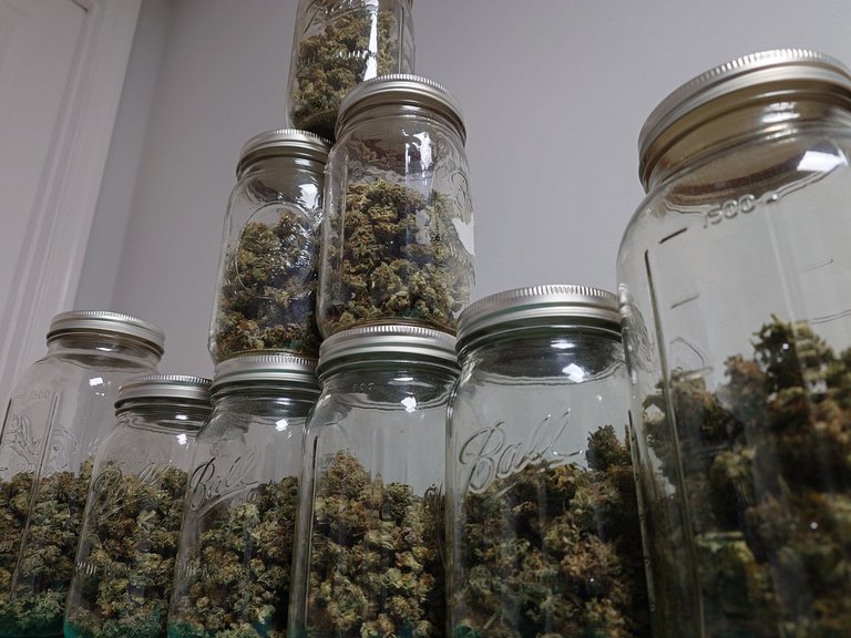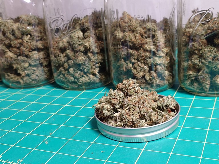 Seven smaller jars and two bigger jars is the harvest. I think I will move the buds to all big jars eventually. Takes less time opening jars when I have less, but just used what I had on hand.